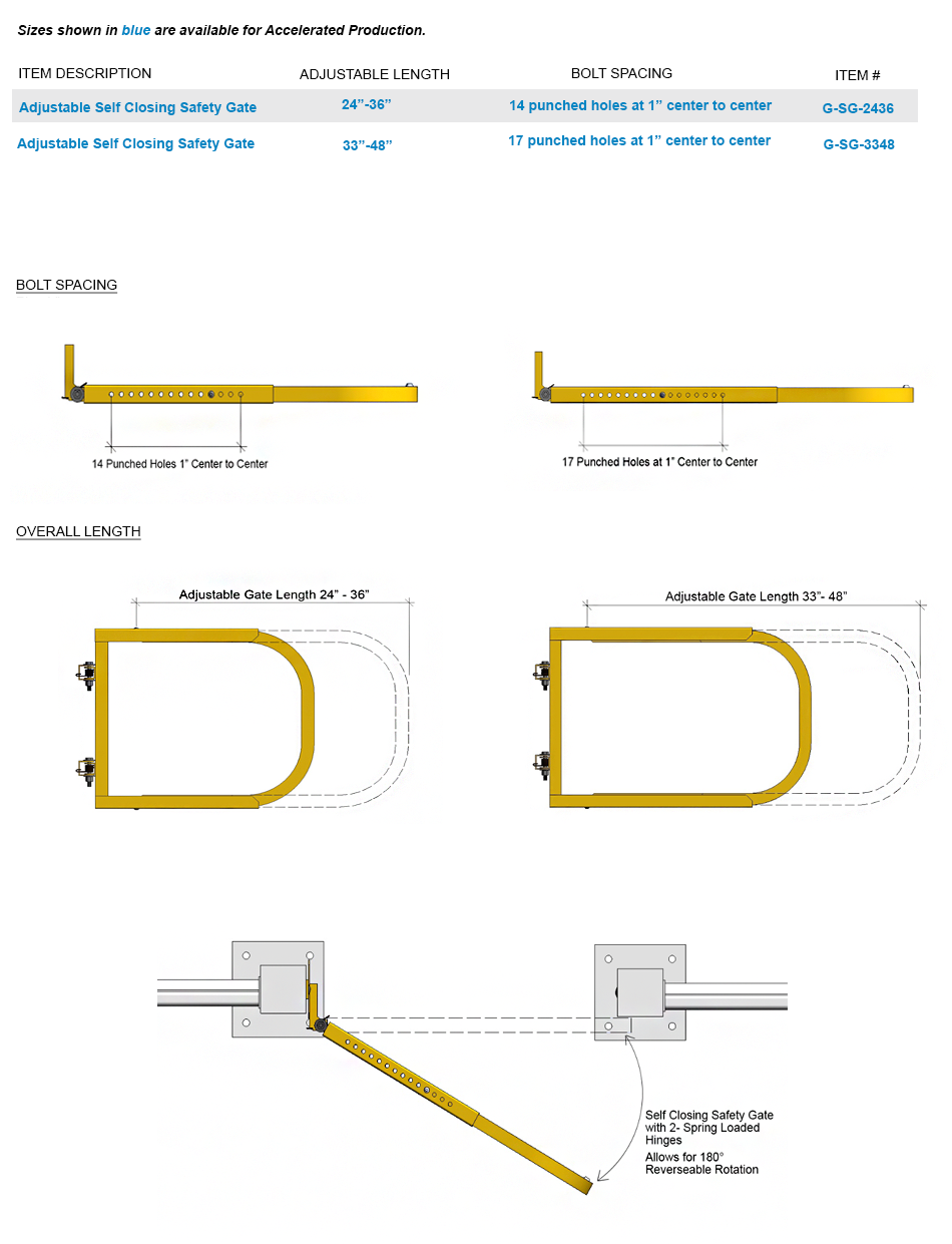 The 24” to 30” adjustable gate is sized with (14) Ø7/16” punched holes spaced 1” apart center to center. The 33” to 48” adjustable gate is sized with (16) Ø7/16” punched holes spaced 1” apart center to center. Spring-loaded hinges allow the gate close automatically, reducing the risk of unknowingly walking or backing into the opening. The flexibility of the spring allows the safety gate to swing back and forth, making both sides of the gate easily accessible. Powder-coated safety yellow paint finish.