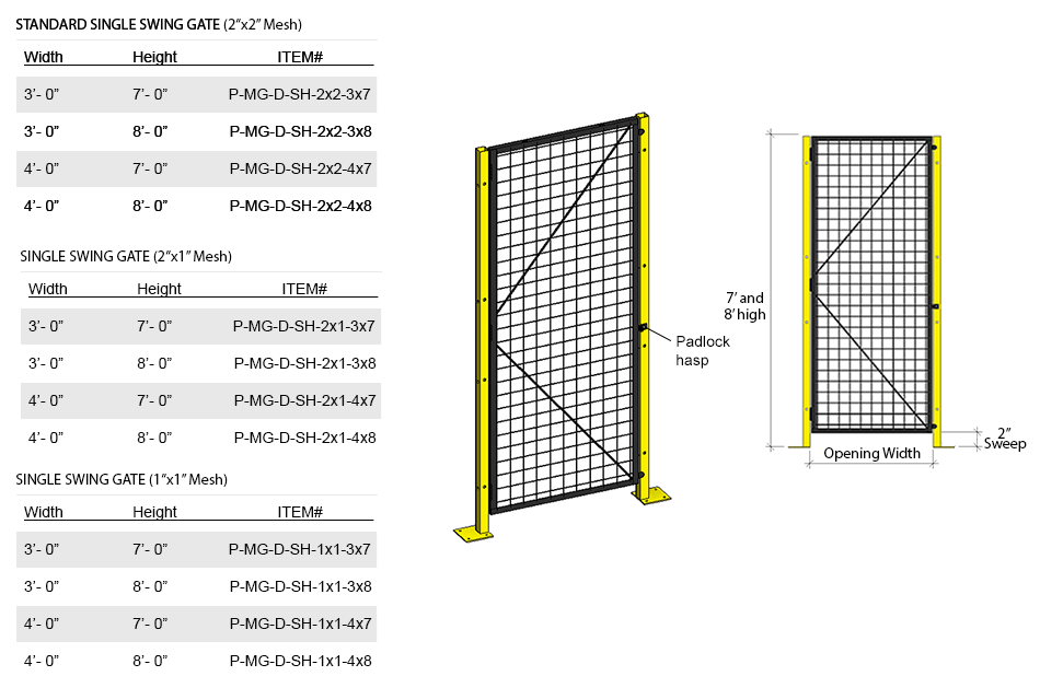 Single swing doors are made of 2” x 2” x 10GA welded wire mesh framed in 1 1/4” x 1 1/4” x 12GA structural angle with two welded 1/2 ø reinforcement rods. A pair of padlock hasps are included. Also available in 2”x1” and 1”x1” mesh.