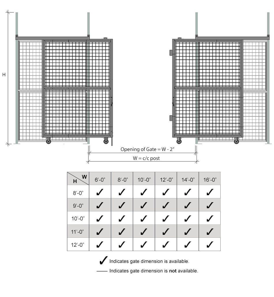 When a wide opening and full height clearance are required for forklift access, nothing works better than a Cogan bi-parting tunnel gate. All bi-parting tunnel gates are equipped with a padlock hasp and heavy-duty 5” soft rolling casters. The top track guide allows for easy slide maneuverability, while the strong bolted steel handles offer a sturdy grip. Doors are made of 2” x 2” x 10 GA welded wire mesh framed in 1 1/4” x 1 1/4” x 12GA structural angle with one or two welded 1/2”ø reinforcement.