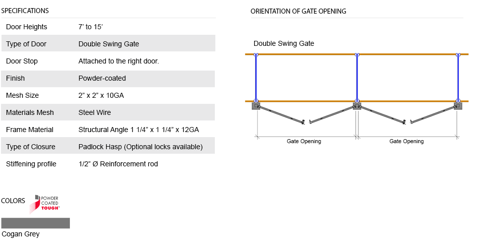 All double swing gates are equipped with a padlock hasp, hinges and door stoppers. Gates can be installed in two different orientations (open inwards or outwards). Additional lock options are also available. Doors are made of 2” x 2” x 10 GA welded wire mesh framed in 1 1/4” x 1 1/4” x 12GA structural angle with two welded 1/2”ø reinforcement rods from center to the corner.