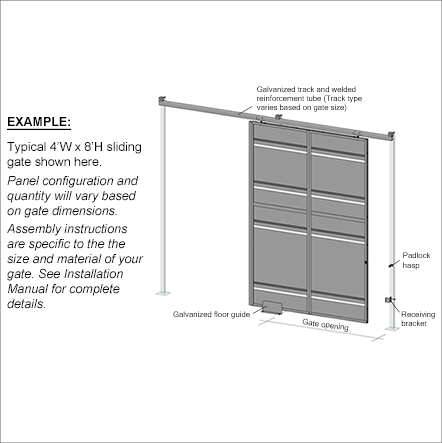 Sliding security gates allow you to have a door opening in constricted areas. With a wide selection of dimensions, sliding gates are ideal for heavy or large equipment and storage access. All sliding gates are equipped with a padlock hasp. Additional lock options are also available. Doors are made of heavy-duty 16GA corrugated steel frame 1 1/4” x 1 1/4” x 12GA structural angle.