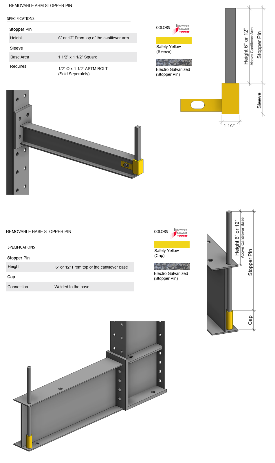 The removable stopper pin found in the rack arm is shaped like a rectangular tube and is slotted into a 1 ½” square sleeve which is bolted to the end of the rack arm. The removable stopper must extrude 6” or 12” above the top of the rack arm. The removable base stopper pin is shaped as a rod and is inserted to a hollow cylindrical support. The stopper must extrude 6” to 12” from the top of the rack base. The welded arm stopper lip is composed of a rectangular plate which is welded to the top flange of the rack arm in the front. This type of stopper is convenient for material products which have a tendency to slip or slide off. The welded angle arm stopper is shaped as a triangular section made of a folded plate. It is available for the front and back of the rack arm and is welded to the tip. It is primarily used to prevent slippage. Angle arm stoppers are welded on top of each arm to keep materials centered on the arms.